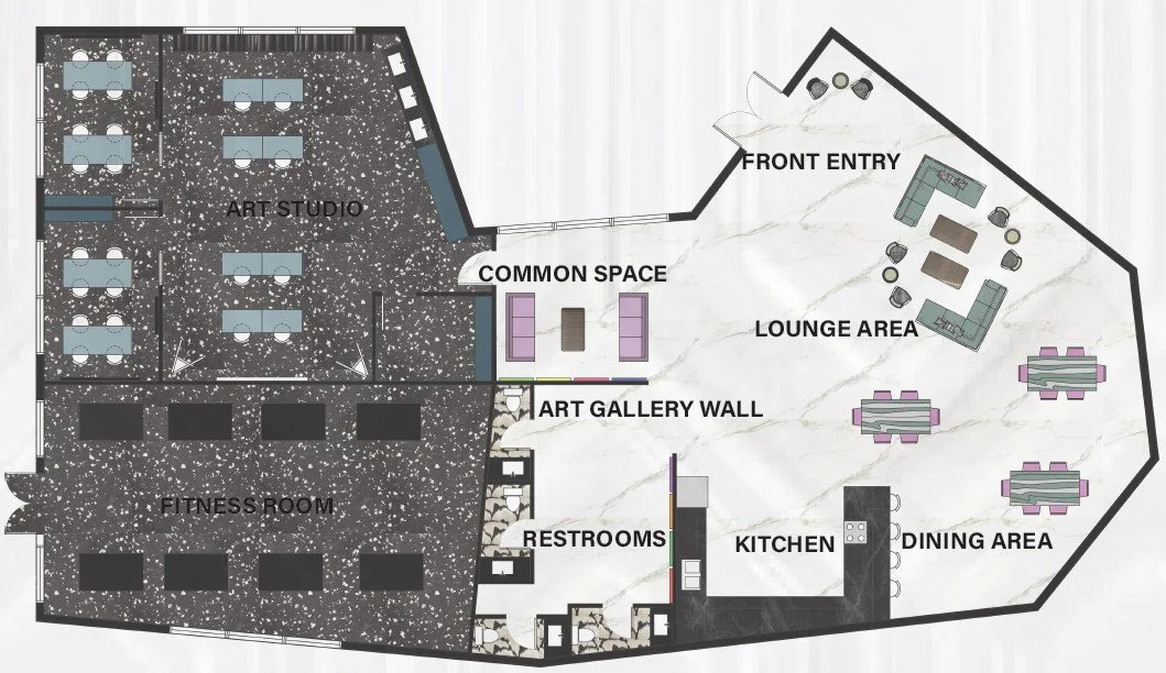 I designed a co-housing community for artists that incorporated a collaborative community in the Houston Heights District. Inspiration was drawn from the 1920’s, when artists were putting in motion new ideas by debating new inspirations. By using the visual connection from the qualities of water into my design and adding blue hues, these complement and balance the design. The heart of a co-housing community is to bring people together to showcase their talents and inspire their art. This community will allow these artists to set their own ideas in motion.