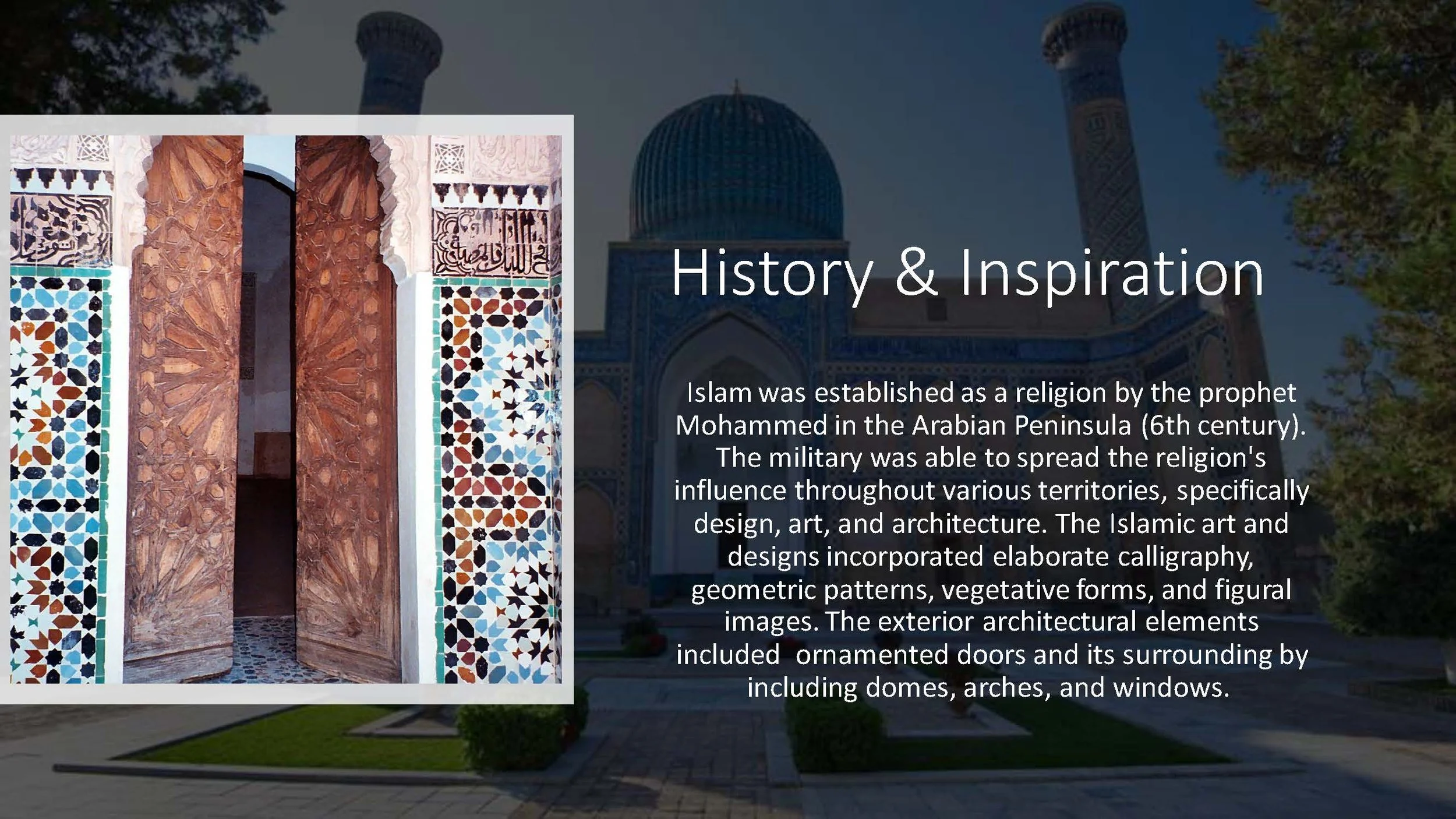 I chose to focus my project on the Islamic design since it has a creative style. I was drawn to the bright colors, various geometric patterns, and playful architecture. The historic nature of the design and its long-lasting influence inspired and challenged me to bring a culture with such a historic significance into a current design with a modern flare.